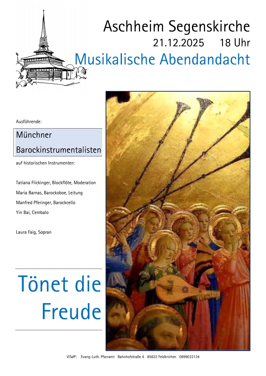 Am Sonntag, den 21. Dezember um 18:00 bin ich mit den Münchner Barockinstrumentalisten wieder zu Gast in der Segenskirche Aschheim. Wir haben ein schönes Programm mit Werken von Bach, Telemann, Eccles und Corelli zusammengestellt und freuen uns auf eine vorweihnachtliche Stunde Musik.